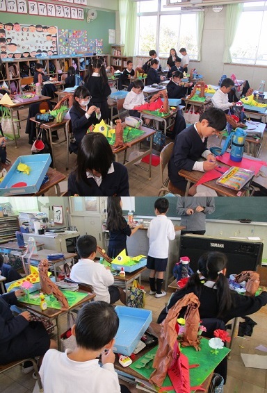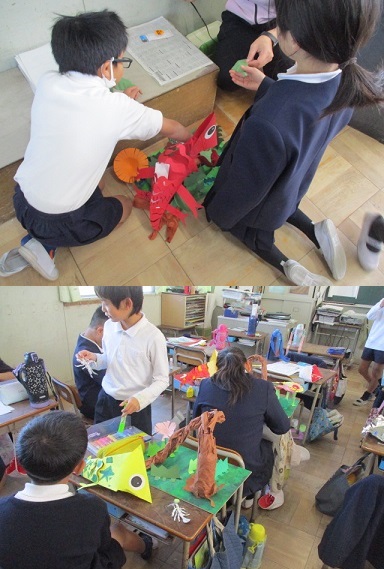 3年生が図画工作科の時間、作品展に展示する工作作品を仕上げていました。