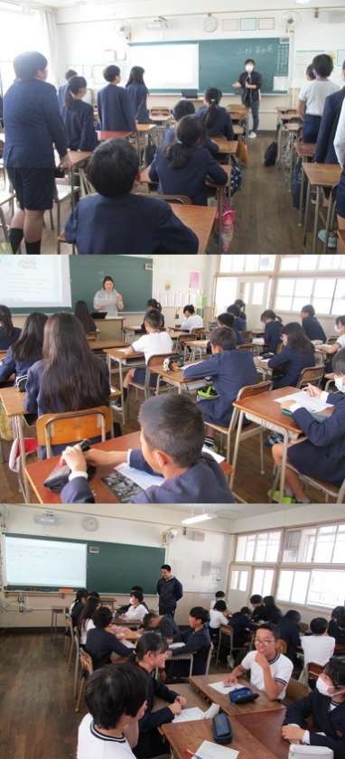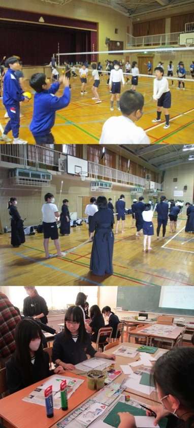 体験授業(英語・社会)を中学の先生から受けた後、部活動体験を中学生のアドバイスを聞きながら、姫島小と福小の6年生と一緒にしました。