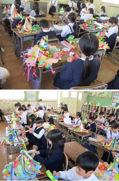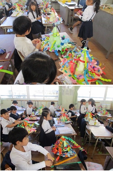 2年生が図画工作科の時間。「わっかでへんしん」の学習に取り組んでいました。