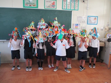 とんがり帽子の形にした色画用紙の周りに、細い色テープや色紙をわっかにして貼るなど、楽しい飾りつけをして、個性豊かな帽子に変身させていました。