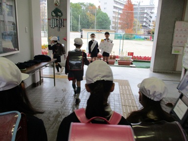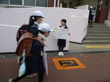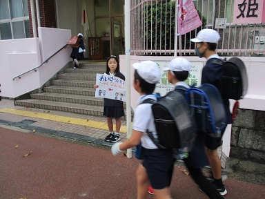 朝から代表委員会の児童がポスターを持ち、たすきをつけて、あいさつを呼びかけていました。