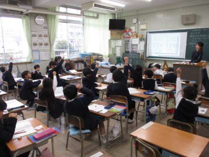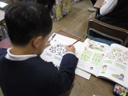 1年生がたくさんの数を正確に数える学習をしていました。10ずつのまとまりをつくって数えるとよいことを学び、実際に大きな数を数えました。