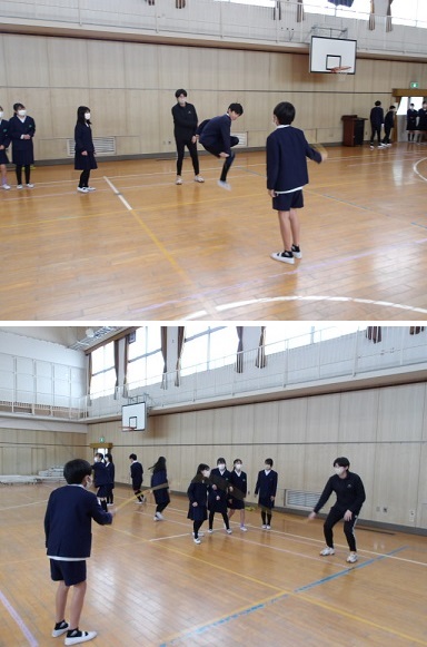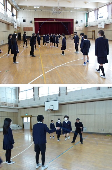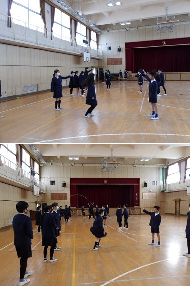 今日(1/11)は、6年1組の子どもたちが20分休みに講堂で、長なわを使い8の字跳びに挑戦しました。大きく縄を回して、一人ずつ入って1回跳んで出るという遊び方です。