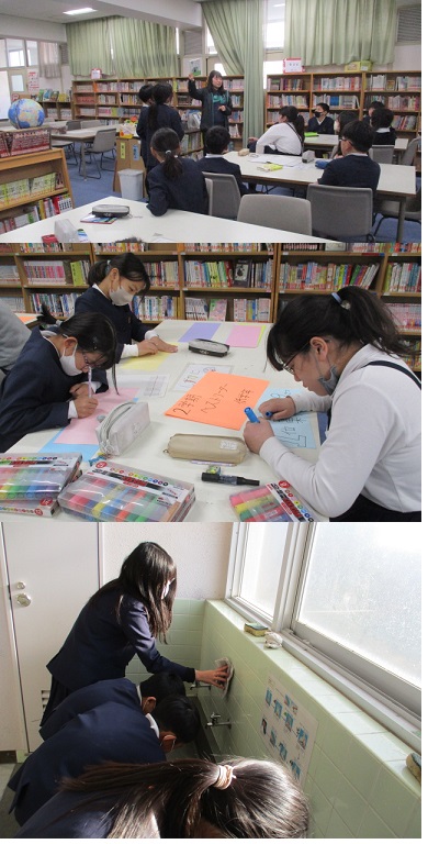 図書委員会は、本棚の整理やシール貼り、2学期にたくさん本を読んだ人を掲示するポスターの作成をしていました。
