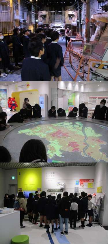 震度7の体験では、阪神淡路大震災や、今後起こるとされている南海トラフ地震での揺れや映像から、地震の怖さを学びました。大阪市全域の地図を見ながら、南海トラフ地震が起きたときの津波や液状化など被害の予想状況の説明を聞きました。