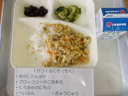 黒豆はミニバットに入れ、熱湯を加えふたをして30分間ひたし、砂糖、塩、こいくちしょうゆを加え、焼き物機、蒸し焼きモードで90分間煮ます。そのあとに、ふたをしたまましばらく味を含ませたら出来上がりです。ピカピカふっくら美味しいです。1月は、お正月の献立、お雑煮やおせち料理が登場します。黒豆はおせち料理の1つです。