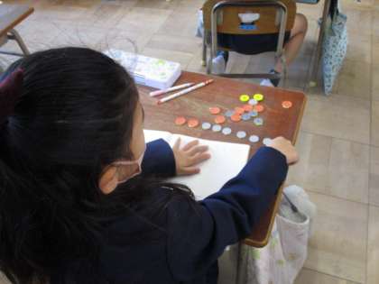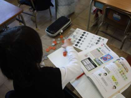 1年生が算数科の学習で、お金の出し方を考える学習をしていました。実際におもちゃのお金を使い、どれを何枚出せば○○円になるか考えていました。