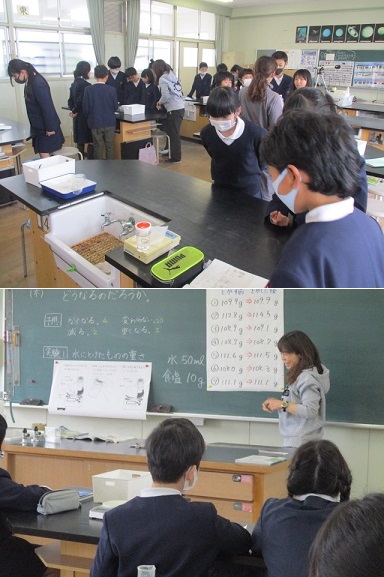 「水にとけたものの重さは、どうなるのか」という問題で、食塩を水に溶かしたらその重さが変わるのかを予想しました。その後、実験をして確認していました。