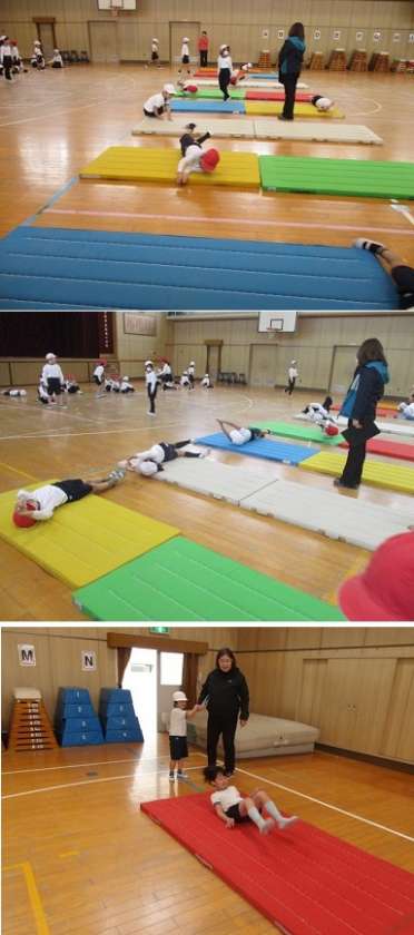 横にころころと転がったり、背中をマットにつけて、ゆりかごのように体を揺らしたりして楽しんでいました。
