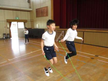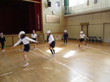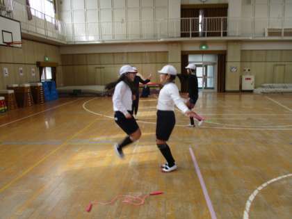 4年生の体育の様子です。サイドステップやクロスステップなどのいろいろな走り方や、2人組での縄跳びなどをしました。