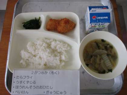 たらフライは、冷凍のまま170度に熱したなたね油で揚げます。1尾、50グラムと食べごたえのある大きさです。給食のたらは、スケソウダラという種類です。サクッと揚がって、身はふんわりとして、美味しいです!!