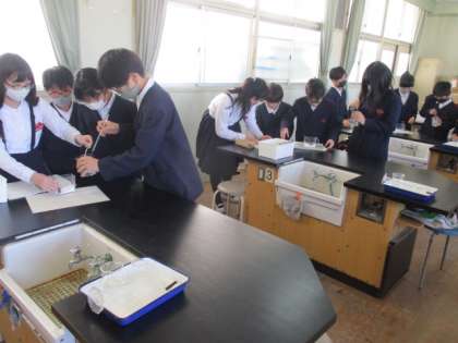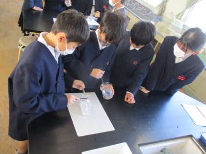 前時までの学習で「ものが水にとける量に限りがある」ことを知り、「もっと食塩やミョウバンを多くとかすにはどうすればよいか」について話し合いました。子どもたちから「水の量を増やす」「水の温度を上げる」という考えが出たので今日は水の量を前回の実験の2倍にして食塩とミョウバンのとける量について調べました。子どもたちは、「これ、もうとけたかな?」「ミョウバンとけにくいわ。」「2倍の量とけるんちゃう?」と様々なことを感じたり、考えたりしながら、友だちと協力して実験に取り組みました。