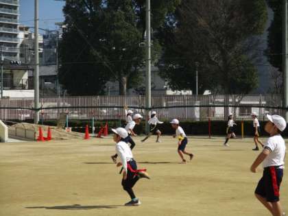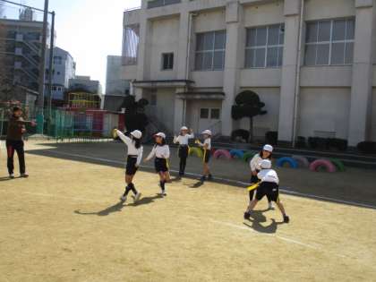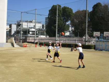3年生が体育の時間にタグラグビーをしていました。タグ取り鬼ごっこをしたり、走りながらパスをしたり、タグラグビーのゲームに向けて練習しました。