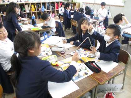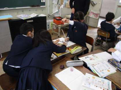 3年生が理科の学習で、音が出ているもののようすを学習しました。トライアングルを鳴らして手で触ってみたり、大きい音の時と小さい音の時の触ったときの違いを感じたりしました。