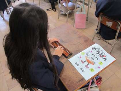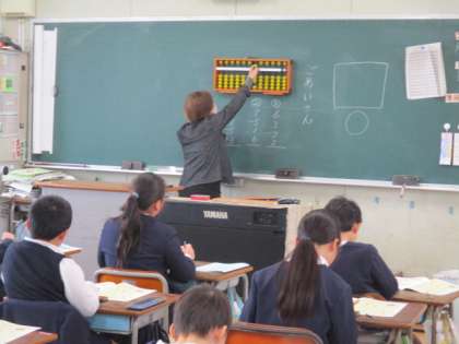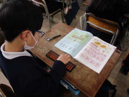 3年生の算数でそろばんの学習をしました。初めてそろばんに触れる児童もいましたが、みんな集中して取り組んでいました。初めて触れたそろばんに「思っていたより簡単」「おもしろい」などの声が出てきました。