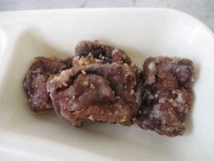くじらのたつたあげは、冷凍のまま170度に熱したなたね油で揚げます。醤油、砂糖、みりん、しょうが、たまねぎで味つけされて、でん紛をまぶしてあるものです。しっかり下味が染みこんでいて、食べやすくなっています。かりっと揚がって、サクサクです。