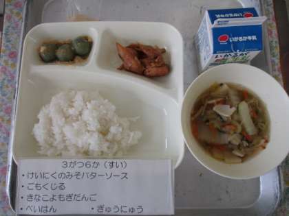 きな粉よもぎだんごは、砂糖、うすくちしょうゆ、湯を合わせて煮、水どきでん粉(でん粉重量の2倍量の水で溶く)でとろみをつけます。その中に、ゆでたよもぎだんごを入れてからめます。喫食時に小袋に入ったきな粉をかけ、いただきます。春色に輝くだんごにみんな喜んでいました♪