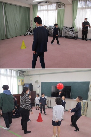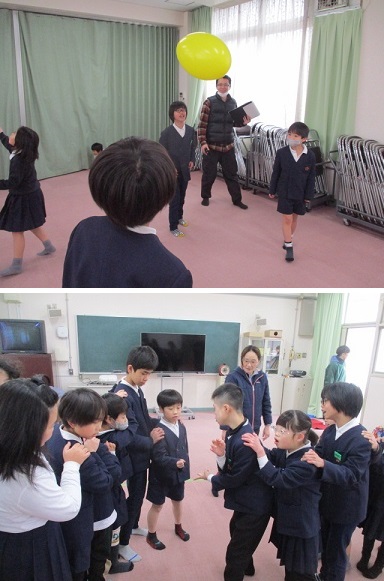 お手玉・風船を使った楽しいゲームやじゃんけん列車をしたあと、下の学年の子どもたちがメッセージカードを渡し、最後に6年生が通れるように向かい合わせになって人のトンネルをつくり、送り出しました。