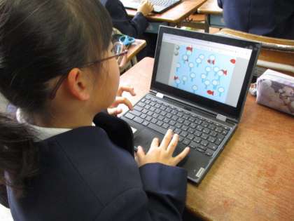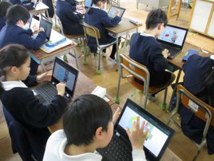 2年生が、学習者用端末のビスケットというソフトを使って、プログラミング学習を行いました。「金魚」と「ポイ」と「袋に入った金魚」の絵を描き、金魚とポイが重なったら袋に入った金魚になるというプログラムを組みました。