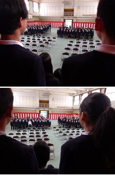 別れの言葉の練習で、呼びかけや歌をそれぞれの立場で行いました。