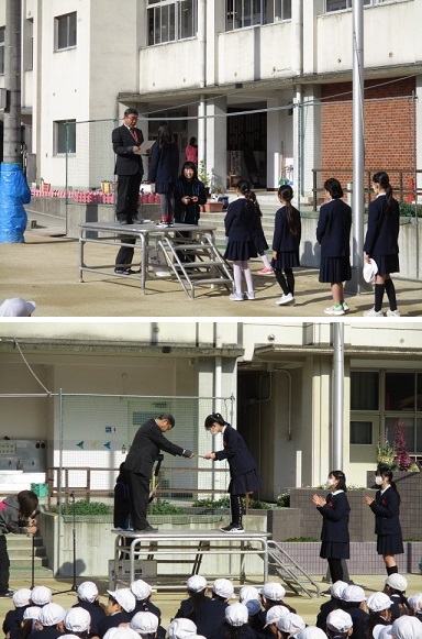 3月11日(月)今日は臨時の児童朝会を運動場でしました。