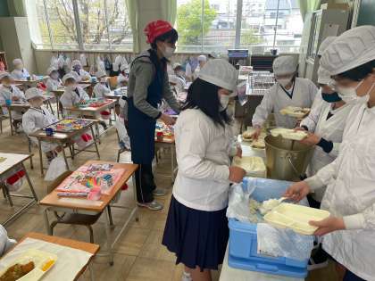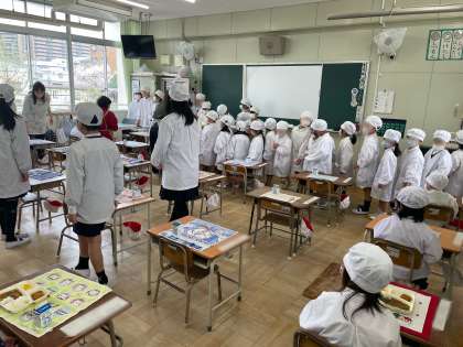 6年生が1年生の給食の準備をお手伝いしました。
