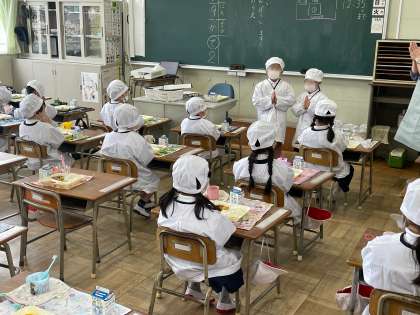 重い食缶や食器を運んだり、おかずやごはんをついでくれたりと、頼りになる6年生です。