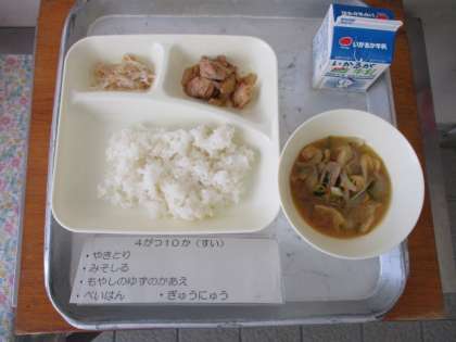 今日の給食は、やきとり、みそしる、もやしのゆずのかあえ、ごはん、牛乳です。