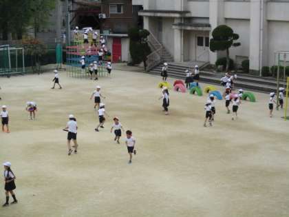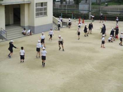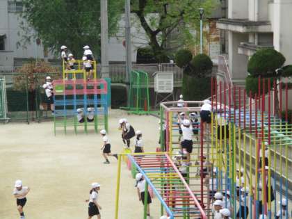 2時間目と3時間目の間の20分休み、たくさんの子どもたちが運動場で遊んでいます。ジャングルジムやうんてい、上り棒などの遊具では低学年の子どもたちがたくさん遊んでいます。校庭では、ドッジボールや鬼ごっこをして、元気に走り回っていました。