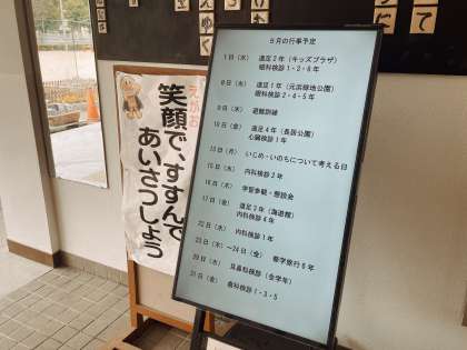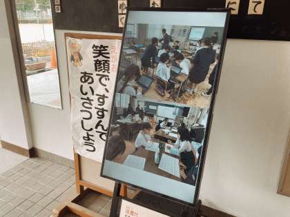懇談会中、玄関にあるデジタルサイレージで子どもたちの様子や行事予定についてお知らせしています。