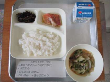 今日の給食は、あかうおのしょうゆだれかけ、豚汁、ひじきのいため煮、ごはん、牛乳です。