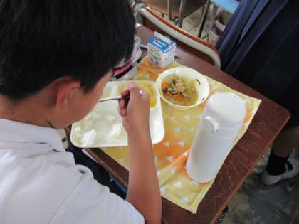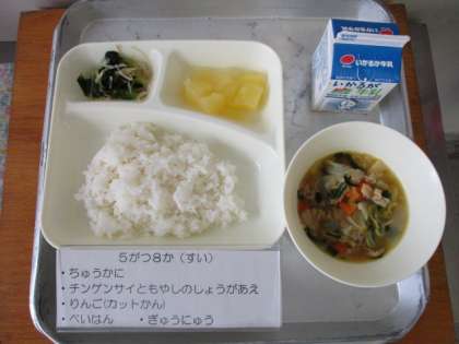 今日の給食は、中華煮、チンゲンサイともやしのしょうがあえ、りんご(カット缶)、ごはん、牛乳です。