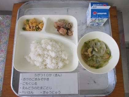 今日の給食は、さけのごまみそ焼き、五目汁、えんどうの卵とじ、ごはん、牛乳です。