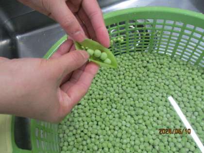 今日のえんどうは、調理員さんがさやから一つずつ取り出してくれています。そのことを伝えると「これ全部手でむいたの?」とみんなびっくり!大切に食べようと話していました。