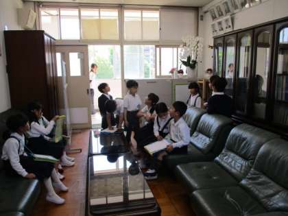 1・2年生がグループになり、2年生が校内のあちらこちらを案内し、説明をしました。校長室に来た子どもたちは、これまでの姫里小の校長先生の写真と応接用ソファーと、校長室が職員室につながっている扉に関心を持っていました。「前の校長先生の写真はあるけど、今の校長先生の写真がないよ。」と不思議そうでした。「校長先生がこの学校にいなくなったら、写真が飾られるよ。」と伝えたら、これまた不思議そうでした。