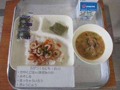 今日の給食は、かやくごはん(きざみのり)、牛乳、みそ汁、まっ茶ういろうです。