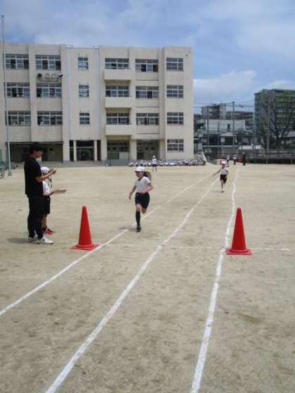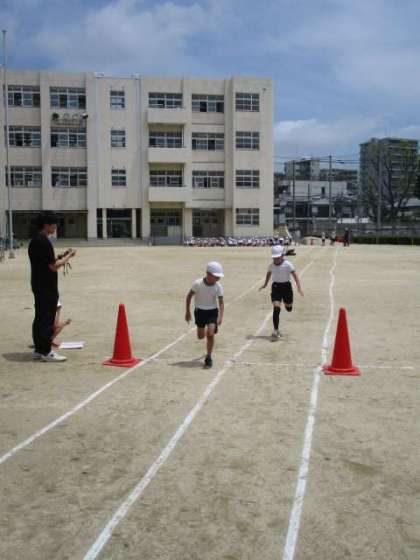 50m走に挑みました。ゴールに向かって一生懸命走っています。自分の記録を更新できるかな。