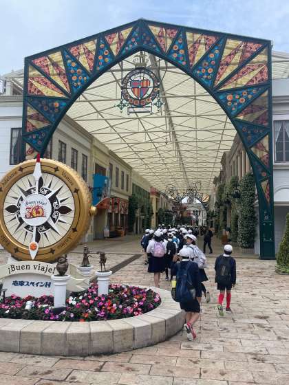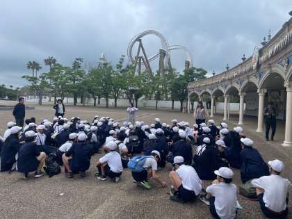 薄曇りで雨は降っていません。学級写真とって入園。さあ、活動の開始です。