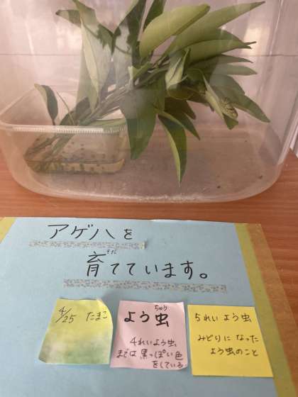アゲハの幼虫の体が、形も色も大きく変わっています。小学校では、習わない言葉ですがこの時期の幼虫を「5齢幼虫」と言います。葉の色に隠れやすい緑の体になっていますね。
