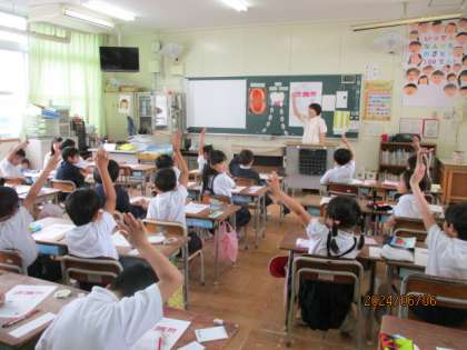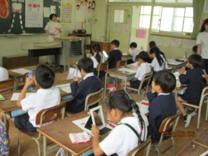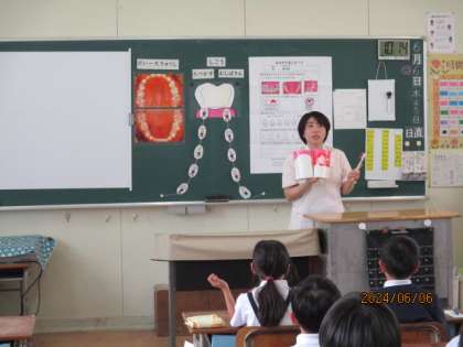 歯科衛生士さんによる特別授業です。歯磨きの大切さ、正しい歯の磨き方の学習をしました。みんな、「はみがき名人」を目指し、健康な体を作りましょう。