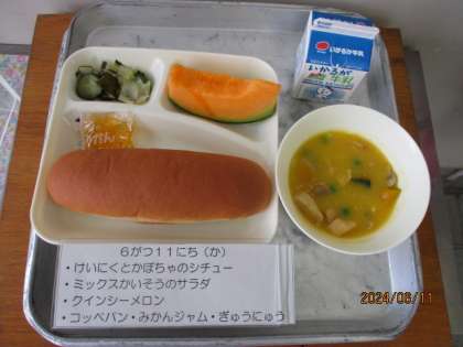 今日の給食は、コッペパン、牛乳、鶏肉とかぼちゃのシチュー、ミックス海そうのサラダ、クインシーメロン、みかんジャムです。