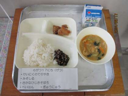 今日の給食は、ごはん、牛乳、鶏肉のてり焼き、みそ汁、魚ひじきそぼろです。