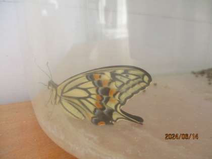 サナギの期間を経て、ついに美しい成虫に成長しました。自由に跳び立てるよう、かごのふたを開けていました。いつの間にか旅立ったようです。たまごから成虫へ、体を変化させて成長するアゲハ。命の神秘、自然の不思議さを感じます。