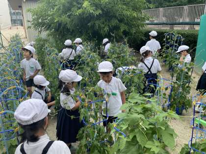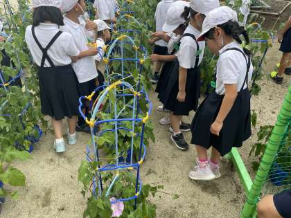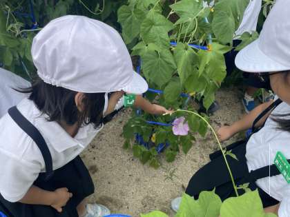 季節は梅雨真っただ中ですが、1年生が大事に育てているアサガオが少しずつ咲き始めました。自分の植木鉢に花が咲いているのを見つけると大喜び。これからどんな色の花が咲いていくのか楽しみです。