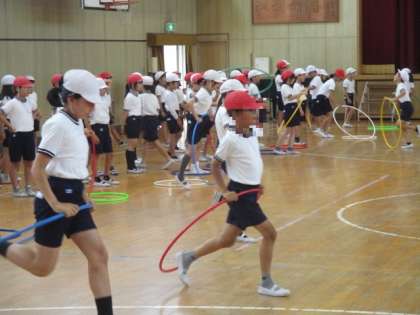あいにくの天気で、プール学習ができなかった今日。かわりに講堂で体育をしました。フラフープを回して、体をくぐらせてフラフープを跳びながら走ります。いろいろな動きを同時に行うので、なかなか難しいようです。リズムよく跳んで早く走れるかなあ。