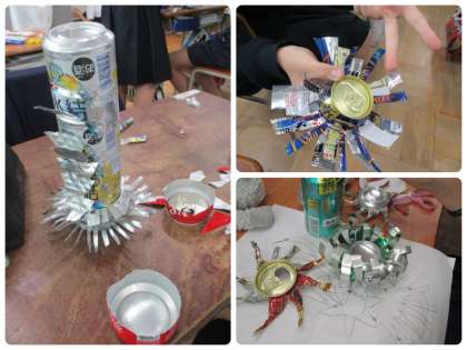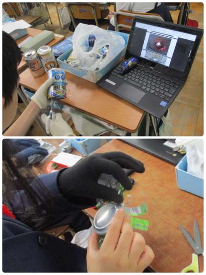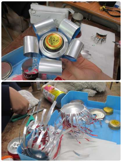 アルミ缶を切ったり曲げたり組み合わせたりしながら、感じた色や形で構成して、想像したことを思い思いに表現していきます。アルミの持つ特徴をもとに造形活動をしていきます。どんなアートになるのか楽しみです。