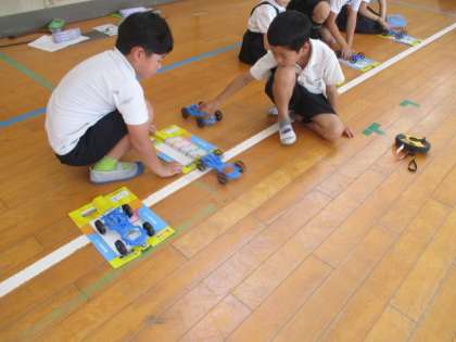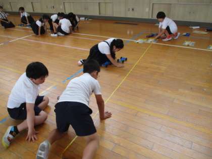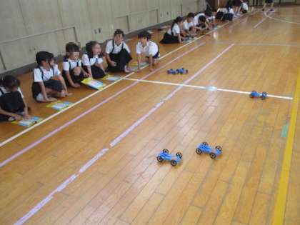 ゴムの伸ばした長さと車が動く距離→ゴムの力(エネルギー)とものを動かす力の関係を調べます。グループで実験の役割分担をし、協力し合って、より正確な結果が得られるようにすることが大切です。一人では解決できない問題に取り組むために必要な力も理科を通して学んでいきます。