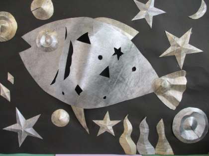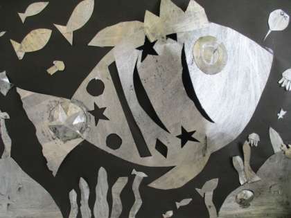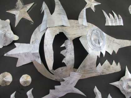 「メガ フィッシュ」の素材は金属?・・・いえ、紙なんです。見た目は、金属でできた魚。絵の具で塗ったところを絶妙にこすって。いろいろな表現方法がありますね。
