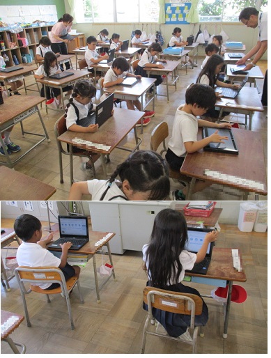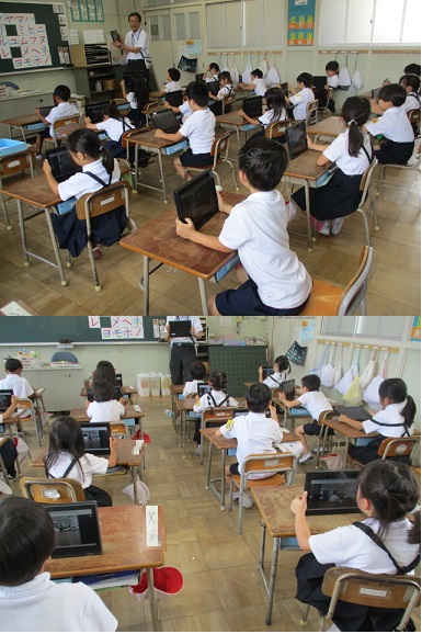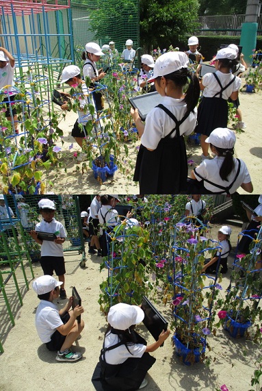 1年生が学習者用端末を使って、あさがおの成長を記録しました。ICT教育アシスタントの方に学習者用端末の使い方を教えていただきました。初めに、写真の撮り方を教わって、自分が育てているあさがおの写真を撮りました。一つの花を大きく写したり、全体を植木鉢も入るように写したりしました。教室に戻って、撮った写真を学習者用端末内の発表ボードに貼り付けて先生に提出しました。学習者用端末の使い方を少し教えてもらうとすぐに使えるようになる1年生。あさがおの成長とともに、子どもたちの成長も楽しみです。