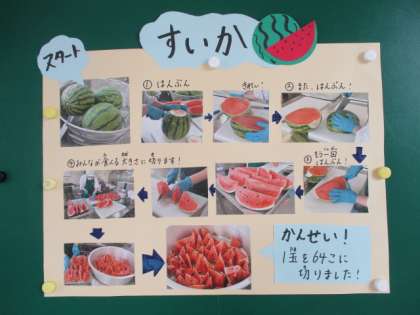 昨日の給食献立にすいかが出ましたね。みずみずしく甘いすいかを給食調理員さんが食べやすく切ってくださっていました。その調理の様子は昨日のホームページでお伝えしましたが、職員室前掲示板でも紹介していますよ。ぜひ見に来てくださいね。